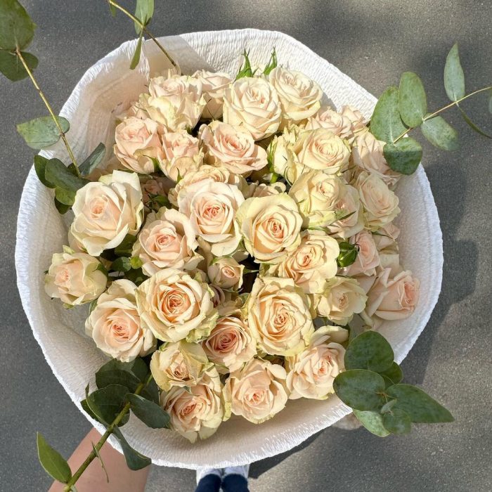 11 пионовидных кустовых роз + эвкалипт