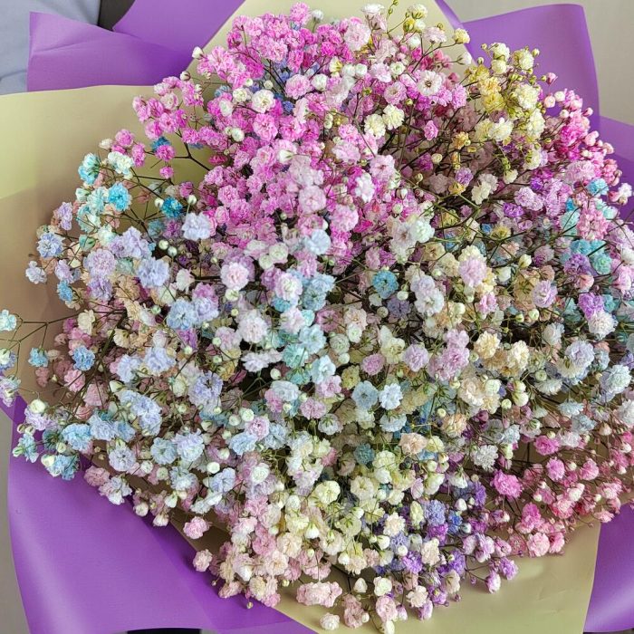 гипсофила радужная – 7 шт.Лента атласная – 1 шт.Дизайнерская упаковка – 2 шт.любовь флориста (бесплатно) – 1 шт.инструкция по уходу за цветами – 1 шт.Средство для продления жизни цветов – 1 шт.