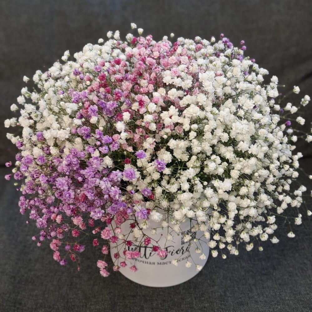 Шляпная коробка – 1 шт.Оазис флористический – 1 шт.гипсофила радужная – 12 шт.