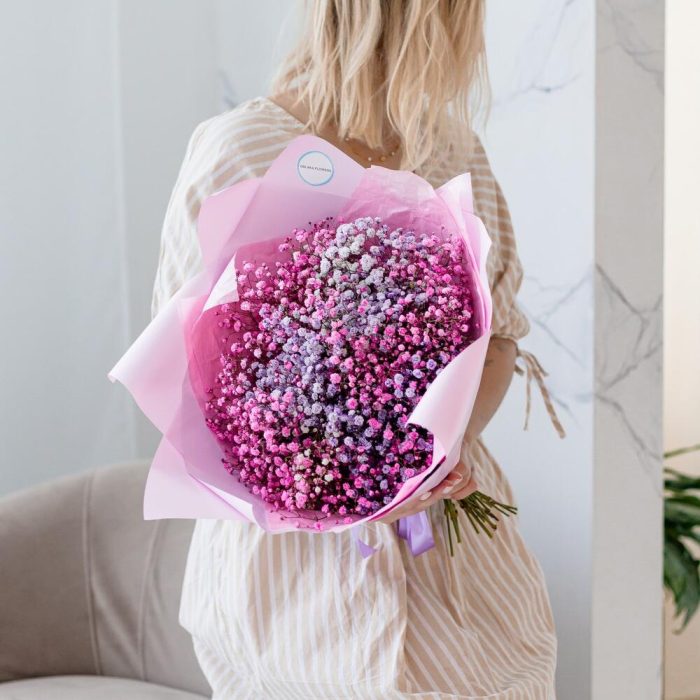 гипсофила цветная – 11 шт.Упаковка корейская пленка – 2 шт.Тишью – 2 шт.Лента атласная – 1 шт.Упаковка транспортировочная пленка – 1 шт.инструкция по уходу за цветами – 1 шт.