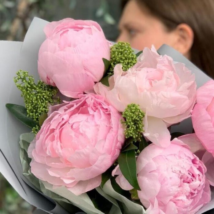 Пион розовый – 5 шт.декоративная зелень – 5 шт.Упаковка дизайнерская – 1 шт.Лента атласная – 2 шт.Открыточка с вашими пожеланиями – 1 шт.хорошее настроение – 100 шт.инструкция по уходу за цветами – 1 шт.коробка переноска – 1 шт.Кризал – 1 шт.