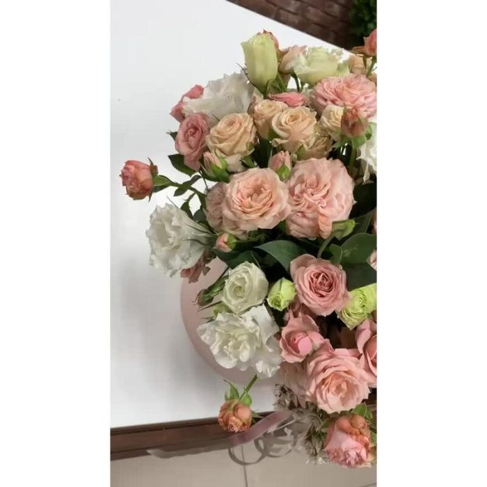 Кустовая роза – 13 шт.Эустома белая махровая – 3 шт.Ваксфлауэр – 1 шт.зелень декоративная – 3 шт.Шляпная коробка – 1 шт.Пиафлор (оазис) – 1 шт.ленты – 2 шт.Тишью – 1 шт.