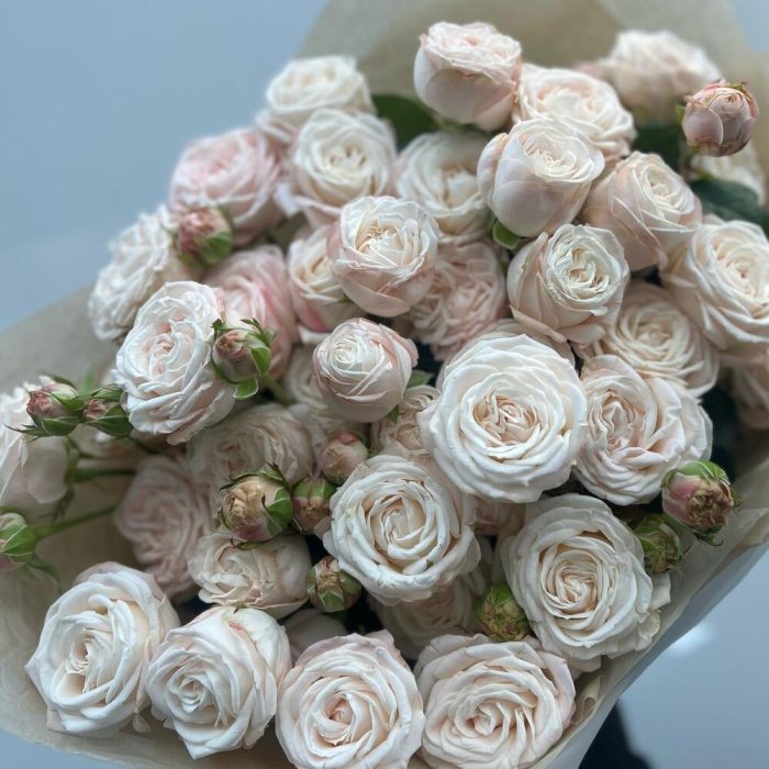 Лента атласная – 1 шт.Кустовая роза Бомбастик – 11 шт.Тишью – 2 шт.Пленка матовая – 2 шт.