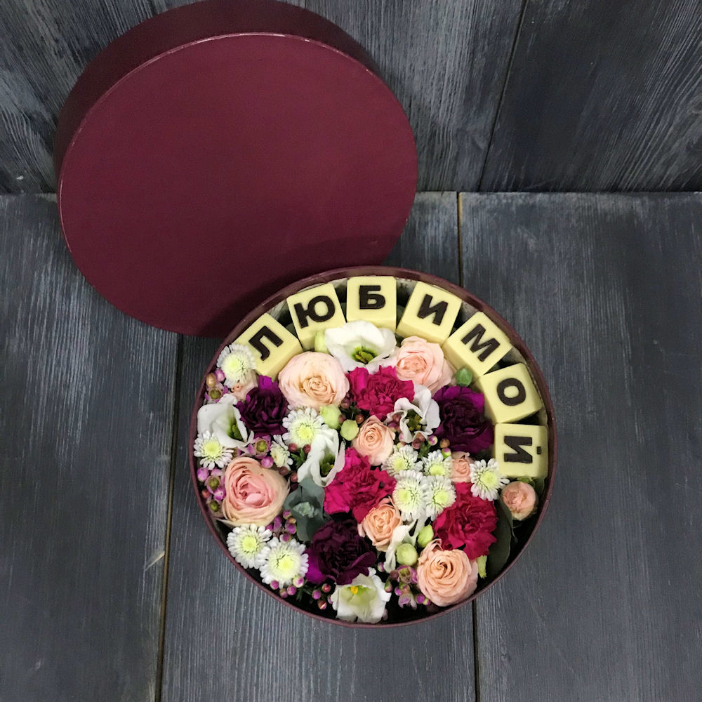 Букет из цветов и шоколадных букв в дизайнерской коробке “Секреты любви”