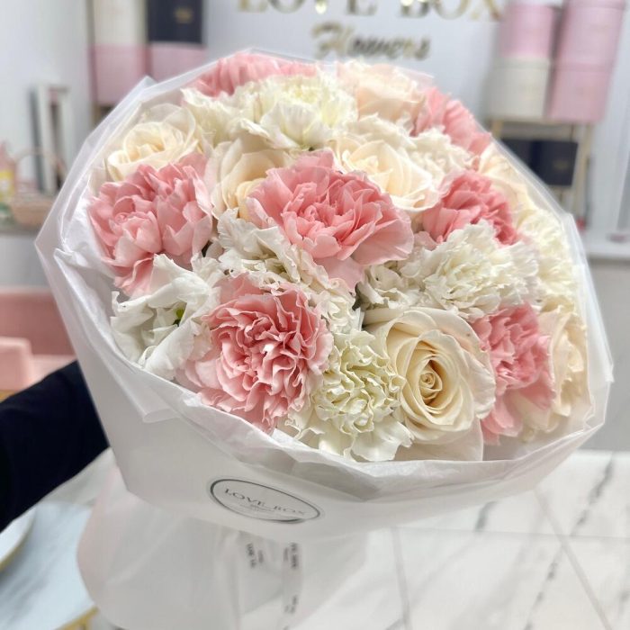 Роза Эквадор – 7 шт.Диантус – 11 шт.Лизиантус – 3 шт.Авторская упаковка – 4 шт.