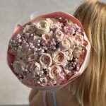 Гипсофила – 9 шт.Кустовая пионовидная роза – 8 шт.декоративная упаковка – 1 шт.Атласная лента – 1 шт.