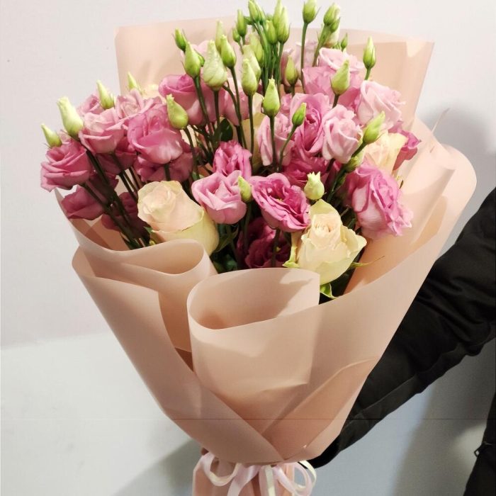 Состав: роза кремовая – 6 шт, эустома розовая- 5 веток.