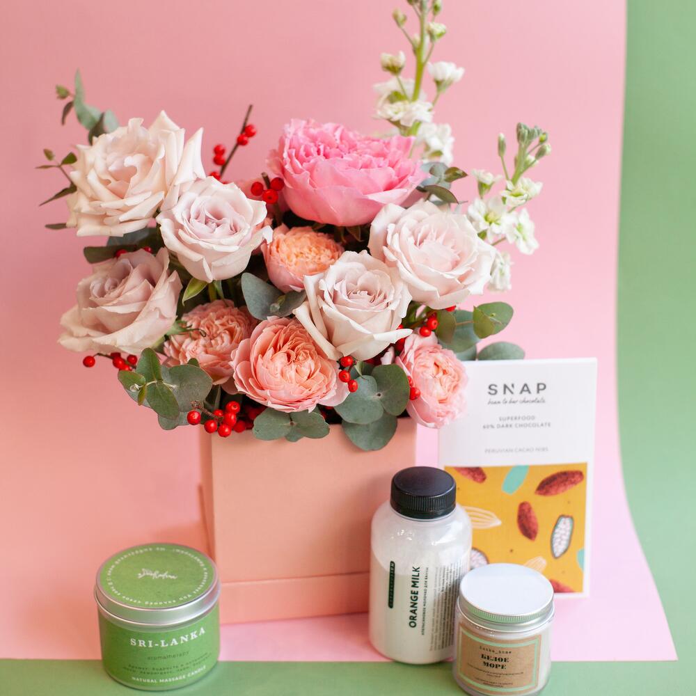молочко для ванной лабораториум – 1 шт.аромасвеча банка хоум 100 мл – 1 шт.шоколад снап – 1 шт.розы пионовидные – 5 шт.Роза – 4 шт.Илекс – 2 шт.Шляпная коробка – 1 шт.