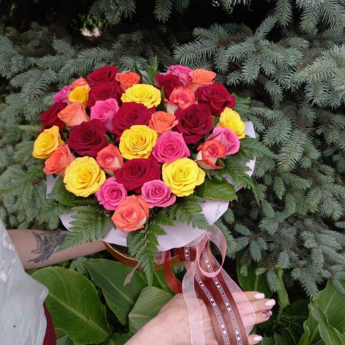 Роза разноцветная – 35 шт. форма сердца – 1 шт. Лента – 1 шт.